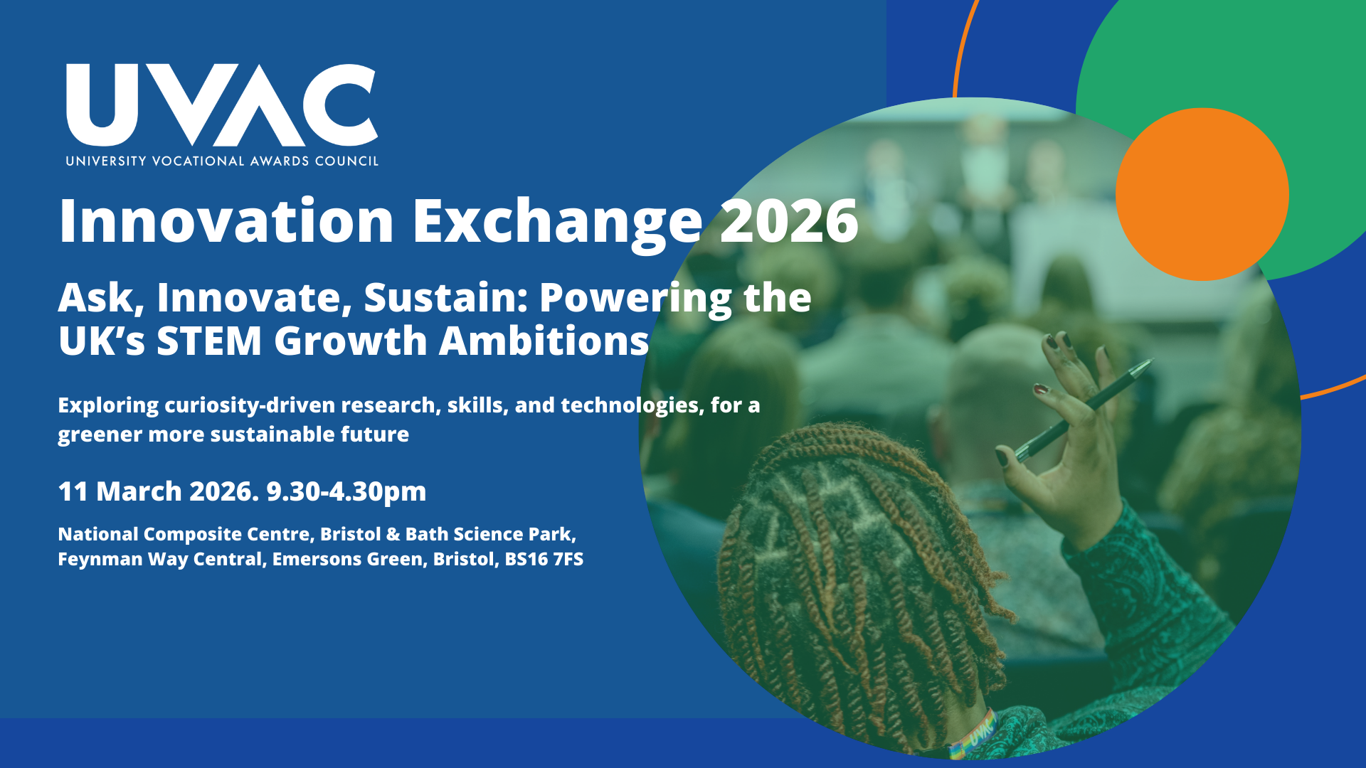 Join us during British Science Week for UVAC’s next Innovation Exchange, Ask, Innovate, Sustain: Powering the UK’s STEM Growth Ambitions, a one-day event bringing together education, industry and research to turn curiosity into impact. On 11 March 2026 at the National Composite Centre, Bristol, we’ll explore how curiosity-driven research, skills and technologies are shaping a greener, more sustainable future for the UK.